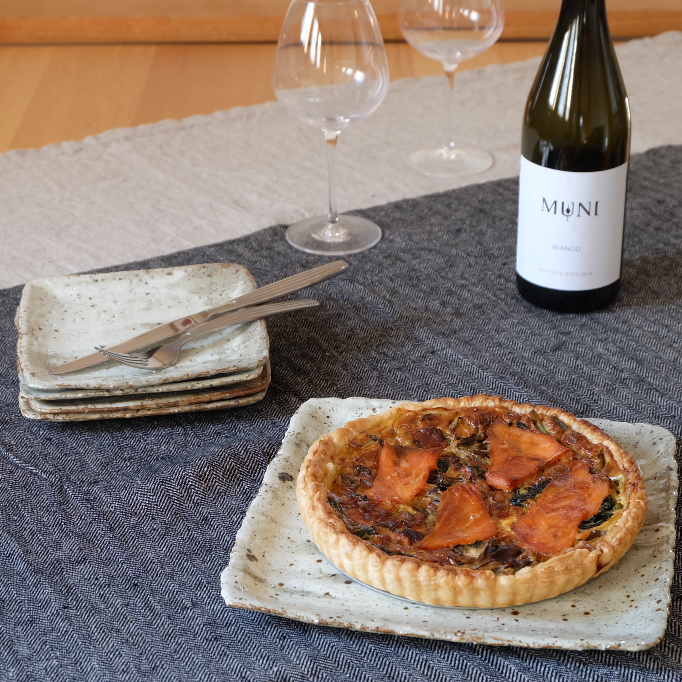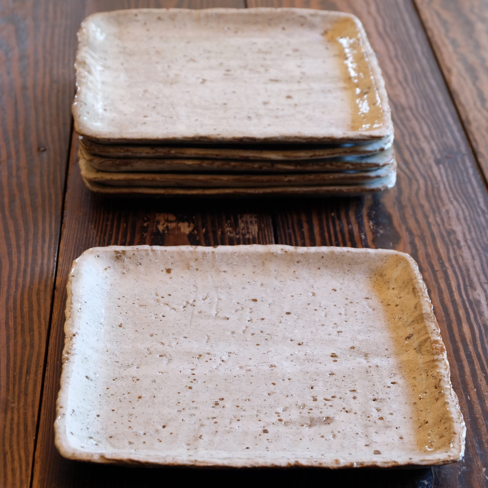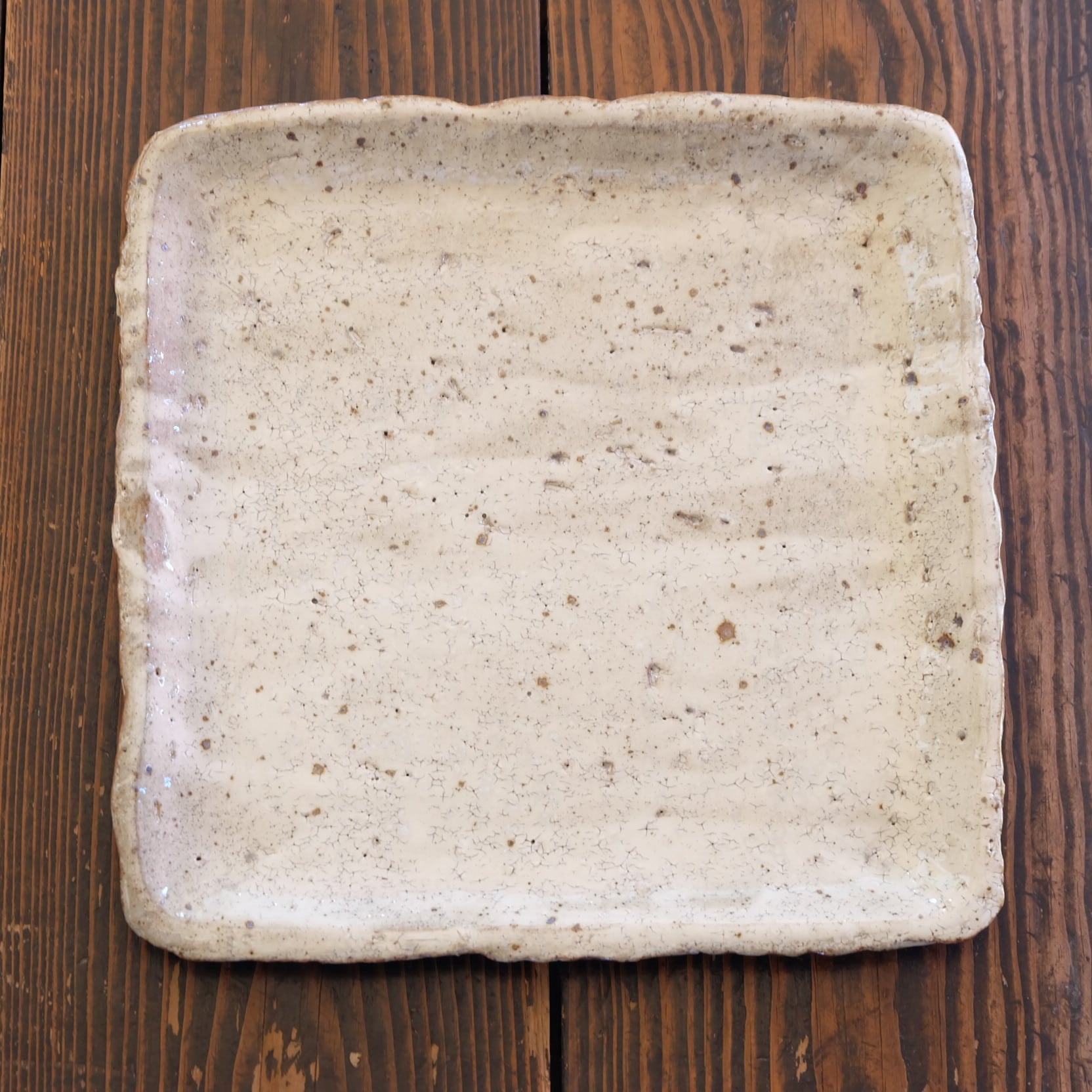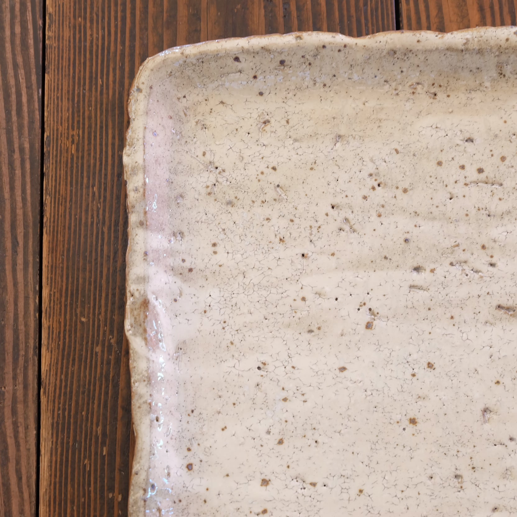 平らなスクエア型の板皿。盛り付け料理や、オードブル、ワンプレート皿としても使えます。和食にも洋食にも合わせやすい粉引きの柔らかなホワイトカラー。