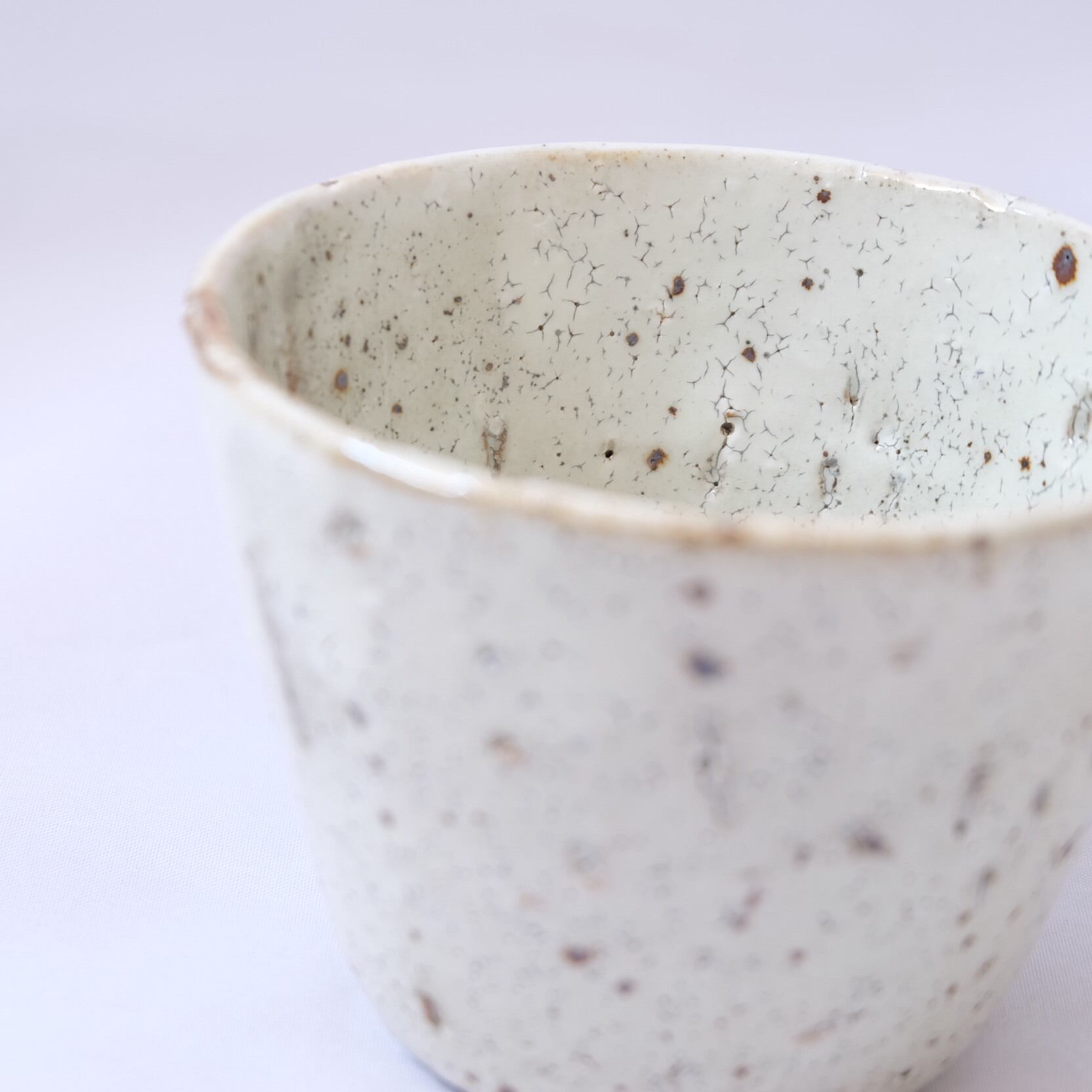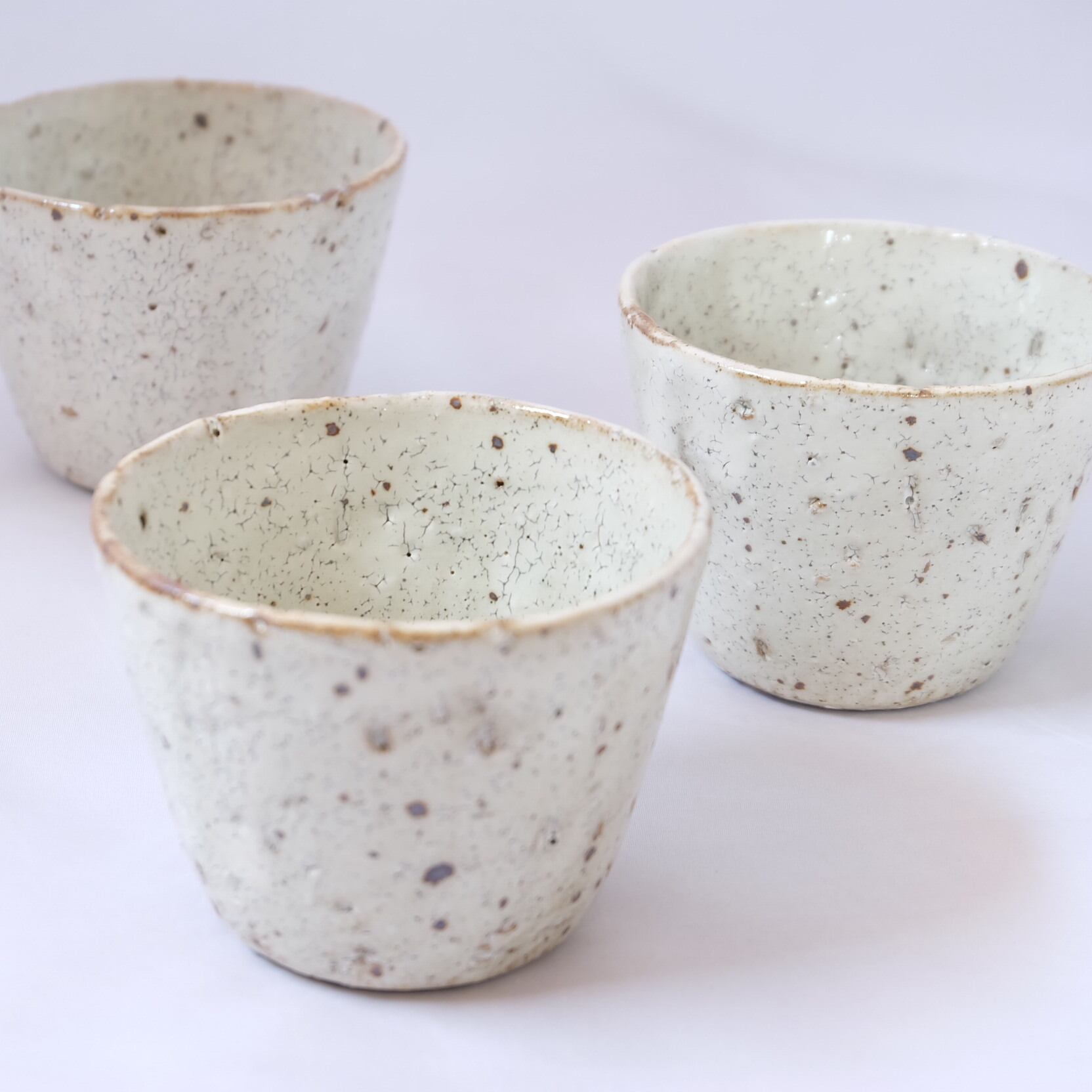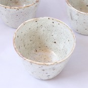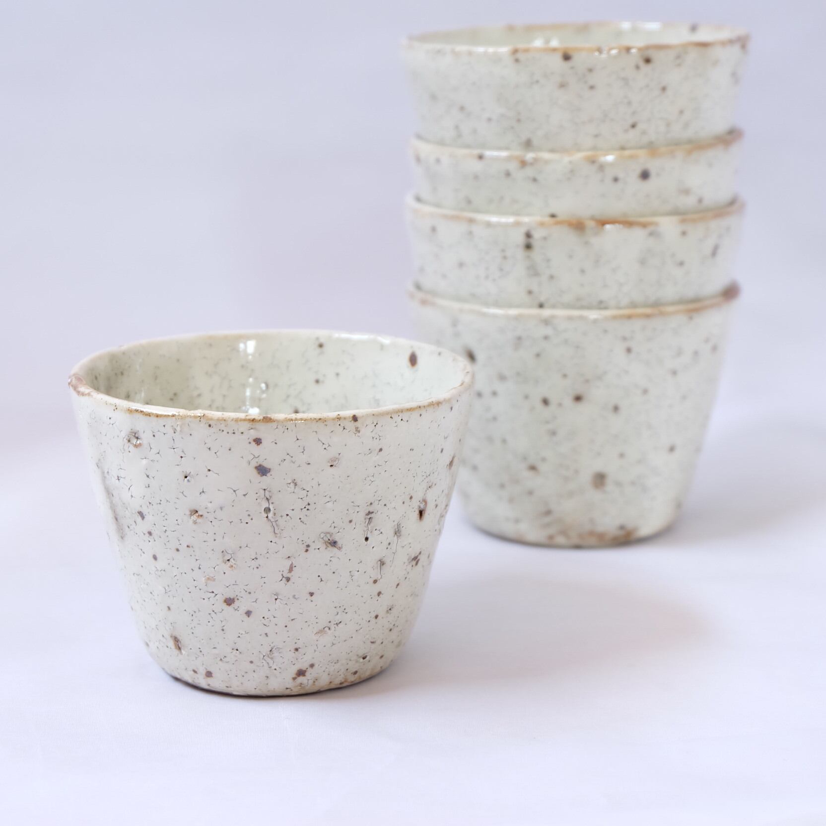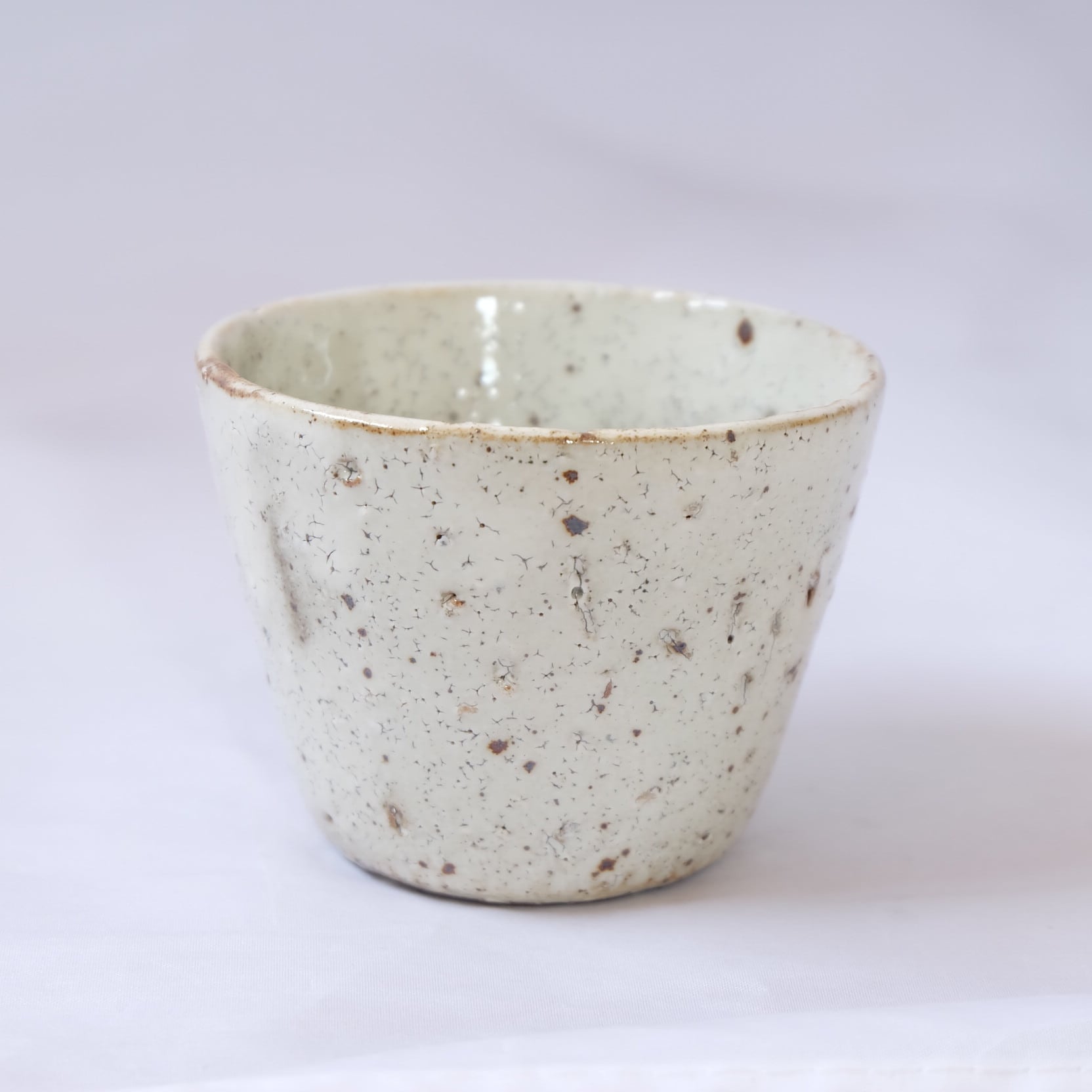 そば猪口型のカップ。お湯のみはもちろん、向付け小鉢としても。使い込むほどに、色や手触りが変わっていく粉引き。器を育てる楽しみも味わって下さい。重なりがいいので、収納には困りません。サイズ:口径8.5㎝ 高さ7㎝