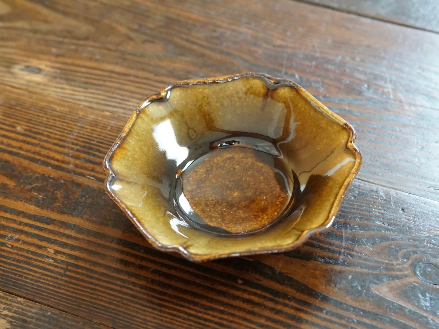 花型のフォルムが、食卓を華やかに演出します。とろりと流し込んだ釉薬の動きと艶やかな飴色は、お料理を一層引き立てくれるはず。